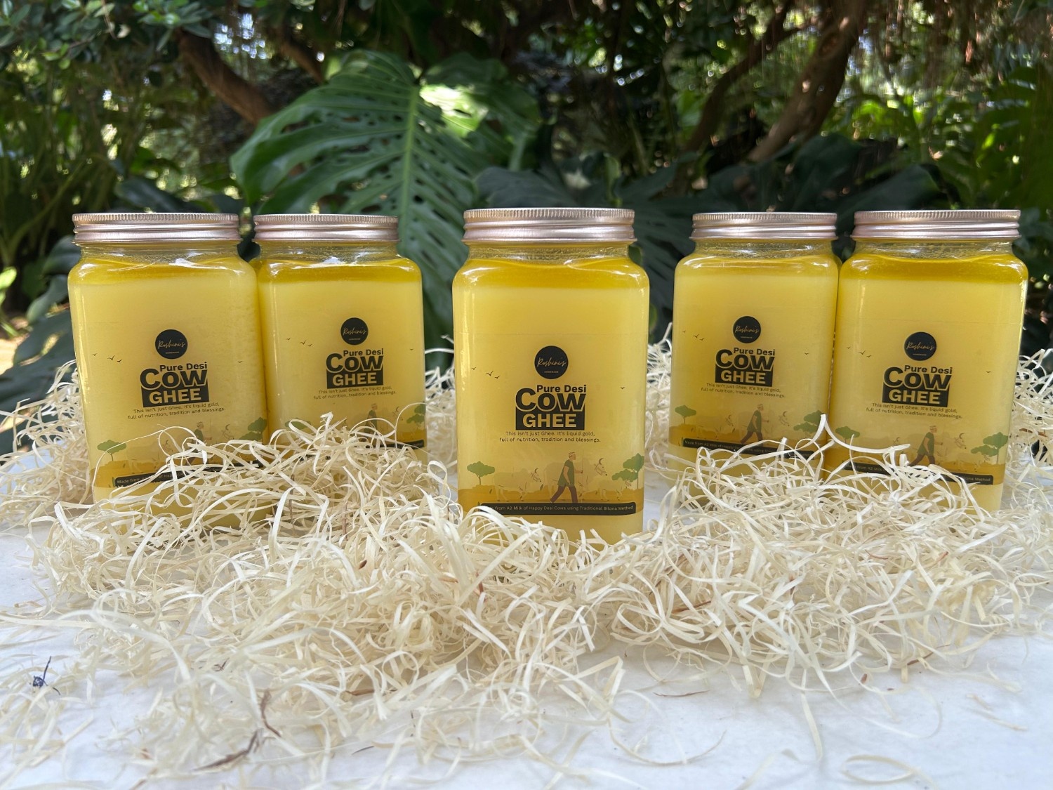 Roshini’s Homemade Ghee is prepared in our small family gaushala with 350 desi cows in Lampur village, near Narela, Delhi. Our cows are fed fresh green fodder enriched with Bajra, Jowar, Moringa, Makka, Molases, Almonds, Dates, and Sheera—ensuring nutrient-rich, sattvic milk.